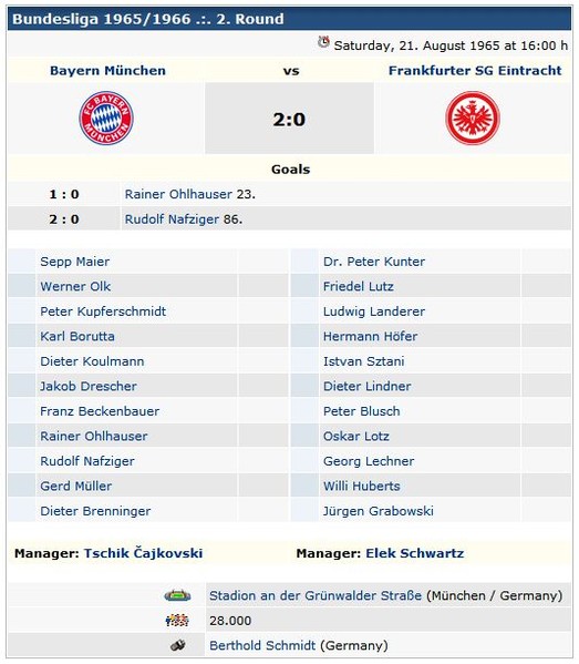 2. kolo | 21/08/1965 | FC Bayern | Frankfurter SG Eintracht | |