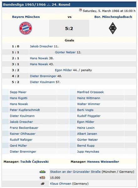 24. kolo | 05/03/1966 | FC Bayern | Borussia Mönchengladbach | |
