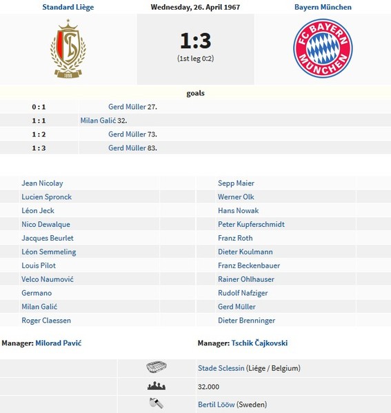semifinále | 26/04/1967 | Standard Liege | FC Bayern | |